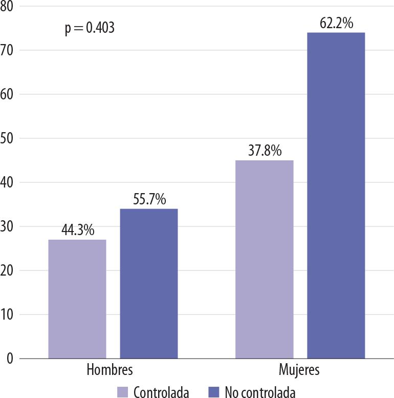 Respecto al control glucémico y las variables sociodemográficas, se observó que el 62.2% de las mujeres y el 55.7% de los hombres estaban en descontrol (p = 0.403, chi de Pearson) (Fig. 1); el grupo de 50-59 años tuvo la mayor proporción de no controlados, con un 65.2%, seguido por el de 70-79 años con un 57.5%; en los de escolaridad primaria, el 61.7% estaban en descontrol glucémico y en aquellos con licenciatura lo estaban el 56%.