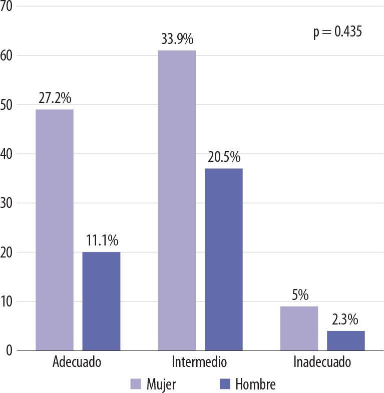 En cuanto al nivel de conocimientos sobre la diabetes, el 54.4% obtuvieron un nivel intermedio, el 38.3% un nivel adecuado y el 7.3% un nivel inadecuado. El promedio de aciertos fue de 17.42 en los hombres y 17.54 en las mujeres, con una media de 17.50 de 24 reactivos (p = 0.435, chi al cuadrado lineal) (Fig. 2).