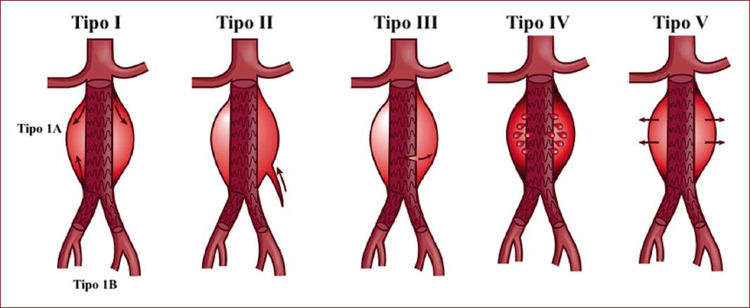 Se define endofuga como la persistencia de flujo sanguíneo por fuera de la endoprótesis aórtica y dentro del saco aneurismático. Es la complicación más frecuente, puede estar presente en un 20-50% de todas las reparaciones endovasculares y la que se asocia a una mayor tasa de reintervenciones15. Las endofuigas se clasifican en cinco tipos diferentes (Fig. 1):