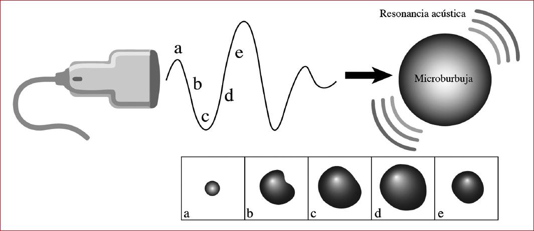 La obtención de imágenes generadas por ultrasonido se basa en la recepción, análisis y la visualización de señales acústicas producidas por la reflexión y retrodispersión del sonido. El método de análisis Doppler permite evaluar la dirección y velocidad del flujo sanguíneo, sin embargo esta modalidad de análisis no permite evaluar la microcirculación o el flujo sanguíneo de muy baja amplitud20. El desarrollo tecnológico de microburbujas ha provisto de nuevas herramientas diagnósticas y conocimientos únicos en la fisiología microvascular que no serían posibles con otras modalidades diagnósticas. Su utilidad como contraste ecográfico se basa principalmente en su compresibilidad. Estas microburbujas se encuentran compuestas de una capa lipídica, rellenas de gas, las cuales sufren oscilaciones volumétricas al ser sometidas a un campo acústico, como consecuencia se comprimen y se expanden en relación con los cambios de presión acústica (Fig. 2). Esta oscilación genera intensas señales acústicas, fenómeno conocido como resonancia acústica. El diámetro de las burbujas varía entre 1 y 10 μm, tamaño similar al de un eritrocito, lo que les permite penetrar en la microvasculatura, el endotelio y el intersticio20,21.