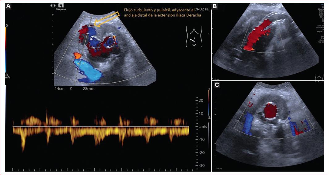 - Evaluación de los sitios de fijación proximal y distal para identificar la presencia de flujo por fuera de la luz de la endoprótesis, así como de sus extensiones.