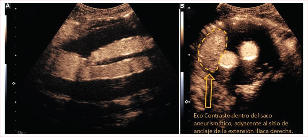 Figura 5 Evaluación de ultrasonido contrastado. A: aplicación de microburbujas, como contraste, el sitio de fijación proximal sin datos de endofugas tempranas ni tardías. B: endofuga tipo IB (flecha amarilla), de realce temprano (< 5 s) adyacente a la extensión ilíaca derecha.