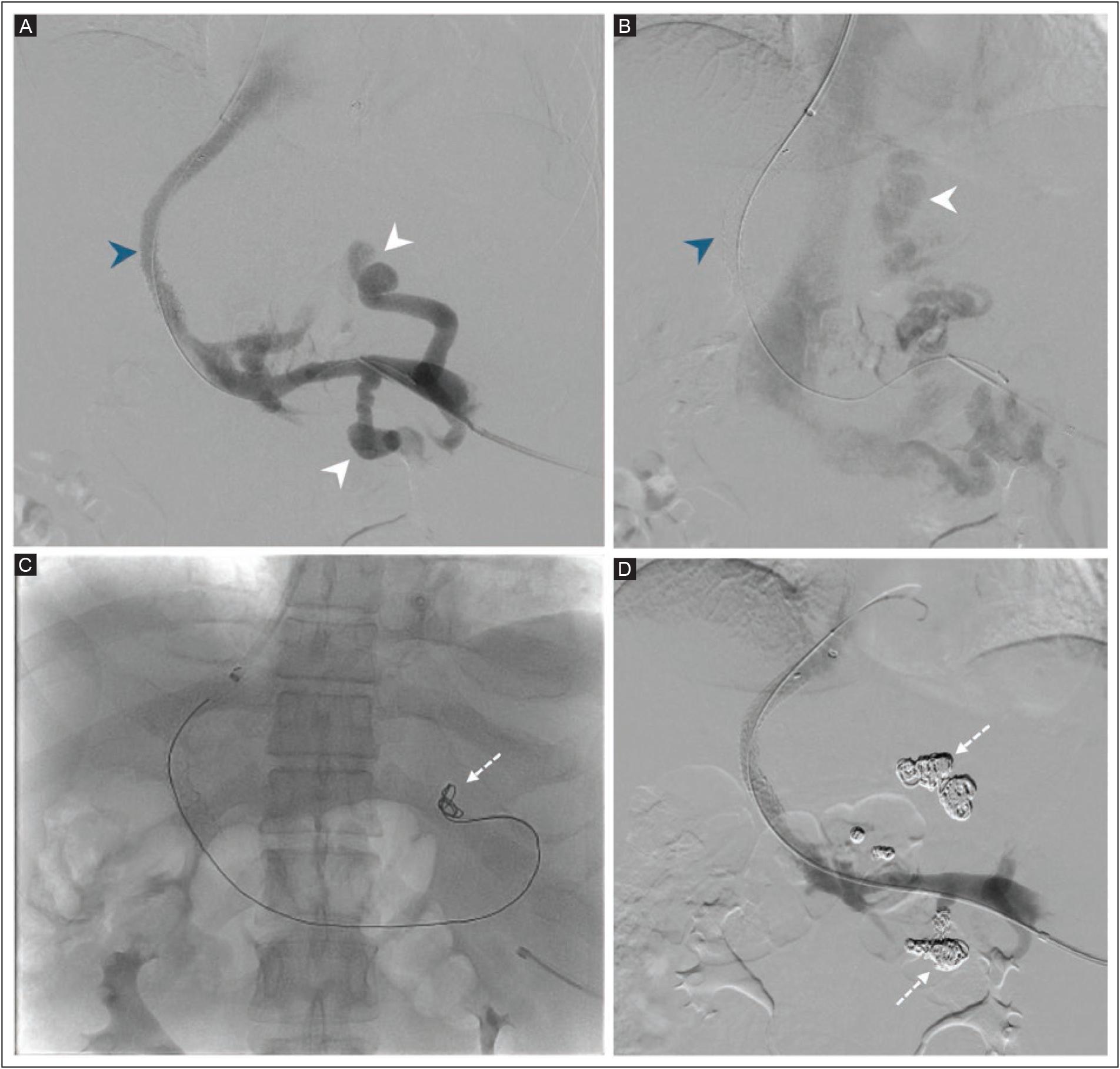 Figure 1 Digital subtraction angiography after TIPS placement in a 39-year-old man with cirrhosis and variceal bleeding. A-B: a covered stent (blue arrowheads) with hepatofugal flow, with multiple venous collaterals, and gastric and renal shunts are seen (white arrowheads). C-D: trans-TIPS embolization of the fugal shunts performed with helical coils (dashed arrows) and ethanol + Gelfoam®.