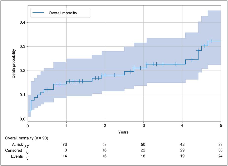 The estimated all-cause mortality for the cohort after the TIPS procedure is shown in figure 2. Mortality was 15.6% at 1 year, 21.1% at 3 years, and 32.3% at 5 years.