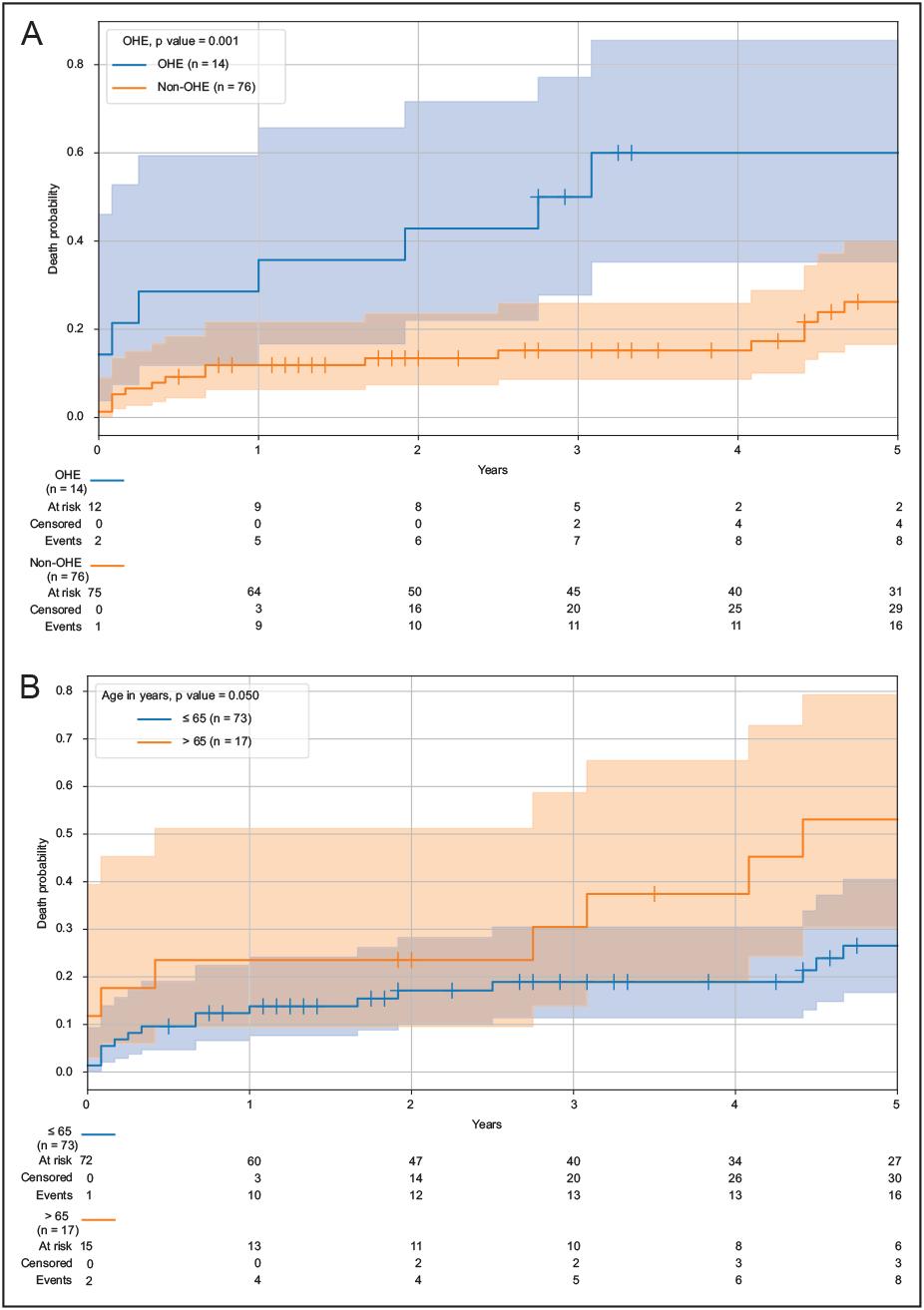 Cirrhotic patients with OHE had higher mortality than patients without OHE (p = 0.001) (Figure 3A). Patients with OHE had a mortality of 35.7% at 1 year, 50.0% at 3 years and 60.0% at 5 years after the TIPS procedure. In contrast, mortality in cirrhotic patients without OHE with TIPS was 11.9% at 1 year, 15.2% at 3 years, and 26.2% at 5 years.