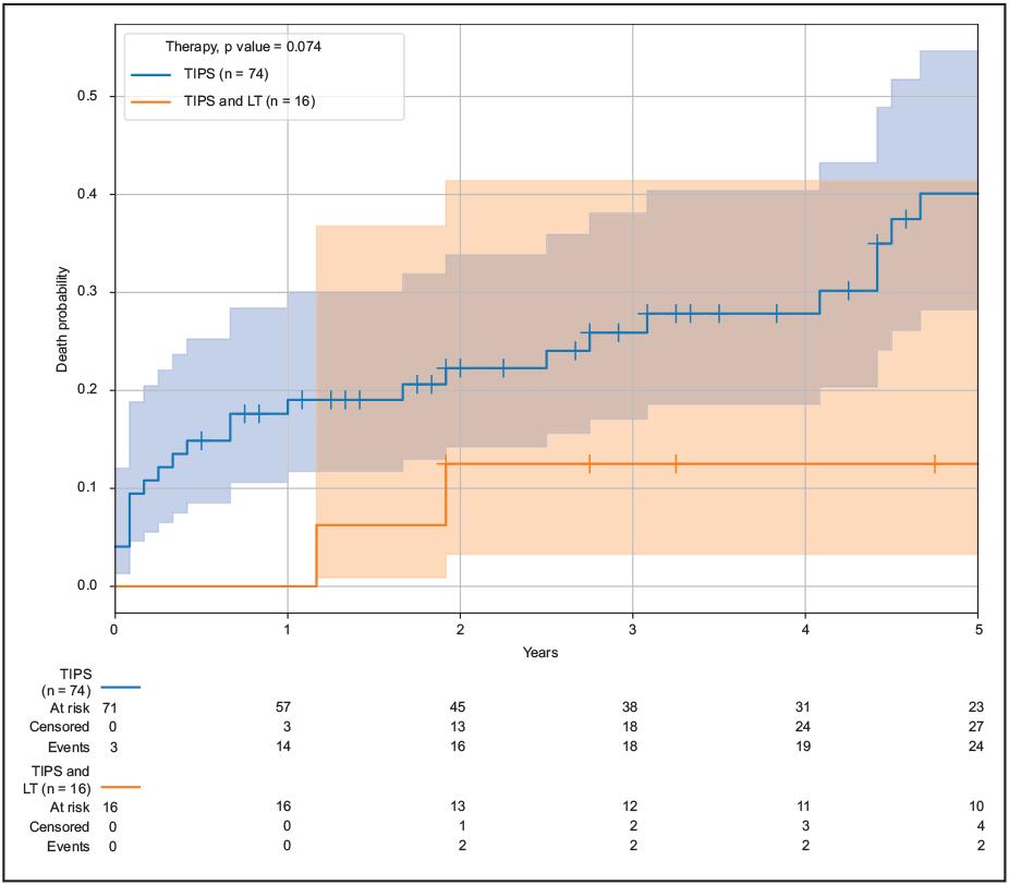Figure 4 Cirrhotic patients with TIPS had a 5-year mortality of 40.1%. Cirrhotic patients with TIPS and LT had a 5-year mortality of 12.5% (p = 0.074). In 16 (17.8%) cirrhotic patients with TIPS who underwent LT after TIPS had a non-significant reduction of 52.0% in the risk of death. The expected survival benefit of LT in patients with cirrhosis and TIPS did not reach statistical significance.