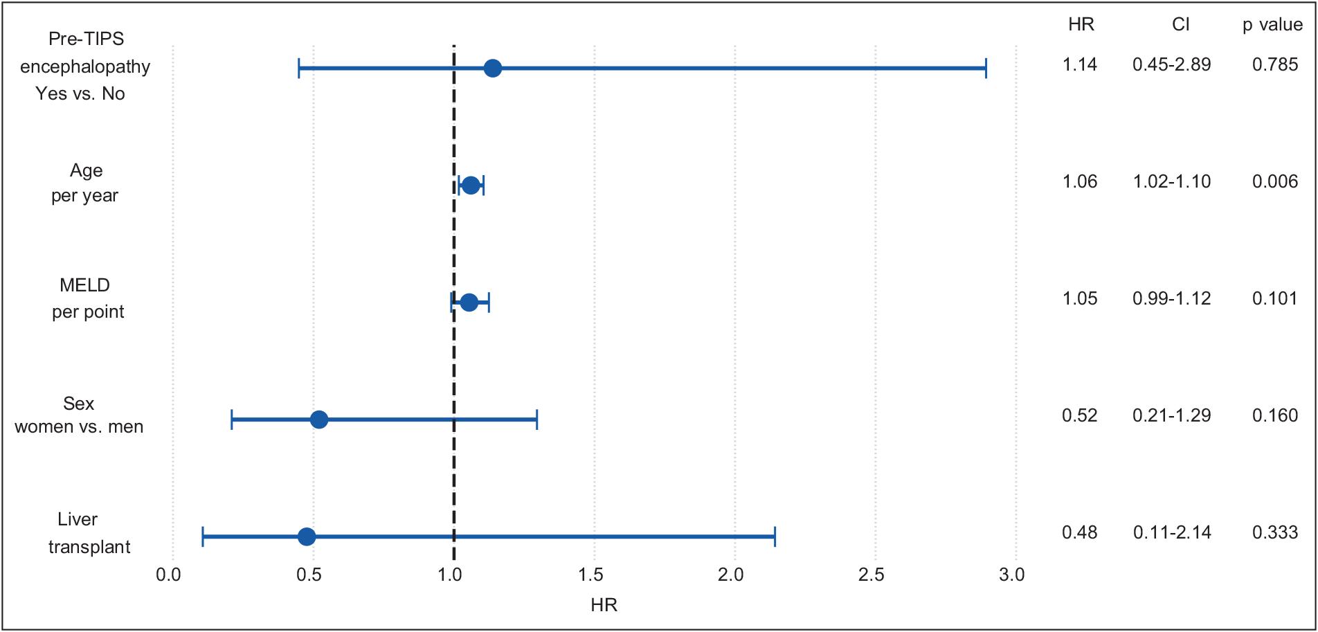aModel based on 90 subjects and 106 patient-periods. TIPS: transjugular intrahepatic portosystemic shunt; MELD: model for end-stage liver disease; PTE: pre-TIPS encephalopathy; LT: liver transplantation; HR: hazard ratio; CI: confidence interval.