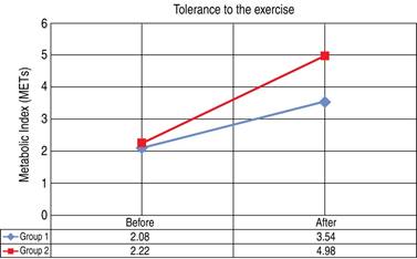 Regarding the perception of the exercise using the Borg scale for dyspnea and fatigue, meters traveled, METs (metabolic equivalent) and VO2 as indicators of tolerance to exercise at the beginning and end of the intervention in each group, an improvement was observed significant in all the variables. Highlighting that, after the intervention, higher values were observed in VO2 for experimental group 2 (7.8 ± 4.3 mL/kg-1/min-1 versus 17.45 ± 3.3 mL/kg-1/min-1). in comparison with experimental group 1 (7.3 ± 5.7 mL/kg-1/min-1 versus 12.4 ± 3.3 mL/kg-1/min-1). As in the values of METs (2.22 ± 1.2 versus 4.98 ± 0.9) (Figure 2), meters traveled (219 ± 53 m versus 399 ± 18 m), dyspnea (8 ± 3.8 versus 4.3 ± 2.3) and fatigue (9 ± 1.1 versus 3 ± 2.6) (Table 5).