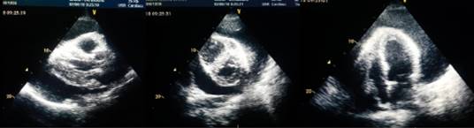Figure 1: Two-dimensional transthoracic echocardiogram, severe pericardial effusion, approximately 1,800 mL volume, with diastolic collapse of right cavities, alternation in transmitral and tricuspid gradient, echocardiographic data of cardiac tamponade.