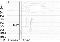 A 75-year-old man, without relevant history, presented with mild exertion dyspnea and palpitations. The physical examination was normal, the 12-lead electrocardiogram showed premature ventricular contractions with a left bundle branch block pattern, normal axis, QS in V1, transition zone between V2-V3, R in D1 and aVL, QS in aVR, which suggested an origin in the tricuspid annulus (Figure 1). A Holter monitoring, documented a 35% arrhythmic burden and transthoracic echocardiography demonstrated an LVEF of 40%, global hypokinesia, and diastolic dysfunction type I without structural heart disease. An electrophysiological study was performed using EnSite Precision Abbott® three-dimensional mapping software (Figure 2). The study showed fragmented and low amplitude electrograms (100 ms duration and < 1 mV) and the precocity index of the ventricular electrogram (-28 ms) in the septal region of the tricuspid annulus (Figure 3). An irrigated FlexAbility™ Abbott® catheter was used to RFA of 30 W with a temperature limit of 25 oC. The PVC’s disappeared during the administration of RFA (Figure 4). Programmed ventricular stimulation was performed, with and without dobutamine infusion, without inducing contractions, neither other ventricular arrhythmias.