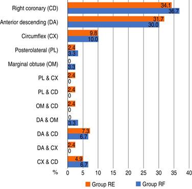 The most commonly affected coronary arteries were the right coronary artery in both groups (34.1% in the RE group and 36.7% in the RF group), followed by the anterior descending (31.7% and 30.0%, respectively) and the circumflex (9.8%) and 10.0%, respectively (Figure 1).