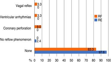 When comparing the immediate complications between patients with successful and failed revascularization, it was found that 97.6% did not present complications in the RE group. The only complication was the vagal reflex, which occurred in only one patient (2.4%). While, in the RF group, complications occurred in five patients (16.7%; p = 0.242). The complications that occurred in the RF group were: non-reflow phenomenon (3.3%, n = 1), ventricular arrhythmias (3.3%, n = 1), coronary perforation (9%, n = 3) (Figure 2).