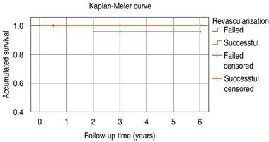 The survival rate between patients with failed and successful revascularization was compared, finding that in patients with failed revascularization it was 96.7% and in patients with successful revascularization it was 100%. The Kaplan-Meier curve is presented in (Figure 3).