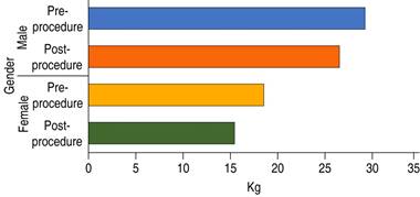 Figure 1: Loss of handgrip strength stratified by gender before the procedure, and after one-month follow-up. Results are expressed as mean ± standard error mean.