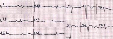 Figure 1: Initial 12-lead electrocardiogram: inversion of T wave in leads V2-V5 with an elevation of ST-segment of 2 mm in leads V2-V4 (anteroseptal necrosis).