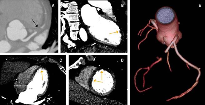Figure 2: Coronary computed tomography angiography. A) Non-calcified occlusive plaque in the proximal third of the left anterior descending artery (arrow). B) Two-chamber view: perfusion defect in the anterior wall during the stress test (arrow). C) Four-chamber view: perfusion defect in the septal and lateral wall at middle and apical segments (arrow). D) Two-chamber view: perfusion defect in the anterior, anteroseptal and inferoseptal surfaces at the mid-segment (arrow). E) 3D reconstruction of coronary arteries: Total occlusion of the left anterior descending artery.