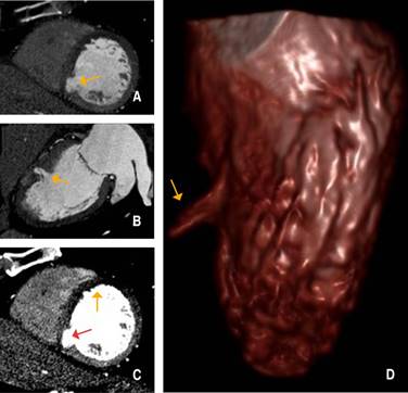 Figure 3: Coronary computed tomography angiography revealing a left ventricular diverticulum. A & B) Two-chamber view (arrow). C) Two-chamber view: Perfusion defect in the anterior and anteroseptal wall at the mid-segment (arrow). Ventricular diverticulum adjacent to ischemic myocardial tissue (red arrow). D) 3D reconstruction of left ventricular volume (arrow).