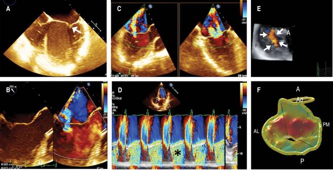 Figure 1: Echocardiographic assessment of the etiology of functional mitral regurgitation by 2-dimensional and 3-dimensional transesophageal echocardiography. All measures were obtained in a single frame during systole for estimation of mitral regurgitation severity. A) Mid-esophageal (0 degrees) four-chamber view showing a restricted posterior leaflet motion compatible with a Carpentier IIIb mitral regurgitation. (white arrow). B) Mid-esophageal three-chamber view (120 degrees) with an anteroposterior orientation of the mitral valve (A2-P2) showing underestimation of severity with a PISA of 6.7 mm a vena contracta width of 5 mm compatible with moderate mitral regurgitation. C) Simultaneous (X-plane) views of mitral valve with 3D assessment in an anteroposterior (three-chamber view) and bi-commissural (two-chamber view) orientation denoting an extensive MR in the bi-commissural two-chamber view. D) Color Doppler M-mode in mitral regurgitation with a holosystolic duration of the jet (black asterisk). E) Transesophageal echocardiography 3-dimensional in-face view of mitral valve with color Doppler evaluation confirming a large effective regurgitant orifice area that occupied the almost complete coaptation line in a commissural orientation. F) Schematic mitral valve model obtained by 3-dimensional transesophageal echocardiography. P = posterior; A = anterior; AL = anterolateral; PM = posterior medial. LVEDV = left ventricular end-diastolic volume, LVESV = left ventricular end-systolic volume, LVEF = left ventricular ejection fraction, LVSV = left ventricular stroke volume, RV = regurgitant volume.