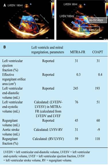 Figure 2: Illustrative findings of functional mitral regurgitation in MITRA-FR and COAPT trials. A) In quantitative mitral regurgitation severity assessment, the left ventricular end-diastolic volume (upper left) and left ventricular end-systolic volume (upper right) allow the estimation of left ventricular stroke volume. This left ventricular stroke volume is ejected in systole throughout the aorta, and other parts of blood flow return to the LA representing the RV. B) Left ventricle and regurgitant volume parameters of quantitative evaluation in both trials. LVEDV = left ventricular end-diastolic volume, LVESV = left ventricular end-systolic volume, LVSV = left ventricular stroke volume, LA = left atrium, Ao = aorta, RV = right ventricle, LV = left ventricle.