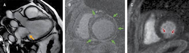Figure 4: A) «Ischemic» functional mitral regurgitation presenting with restricted posterior leaflet motion leads to a homolateral excentric jet (yellow arrow). B) Non-ischemic cardiomyopathy showing subepicardial late-gadolinium enhancement distribution (green arrows). C) Showing ischemic cardiomyopathy with subendocardial inferior late-gadolinium enhancement by prior myocardial infarction (red arrows).