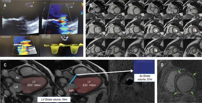 Figure 5: Representative case of the usefulness of regurgitant fraction assessing mitral regurgitation severity in functional mitral regurgitation. A) TTE of excentric mitral regurgitation with restricted posterior leaflet motion consistent with a moderate mitral regurgitation with an estimated effective regurgitant orifice area of 0.3 cm2. B) CMR short-axis cine images in diastole [upper middle] and systole [upper right], showing thinned and akinetic contractility of inferior and inferolateral basal and middle left ventricle segments suggesting an ischemic mitral regurgitation with prior myocardial infarction. C) Volumetric cardiac magnetic resonance assessment of mitral regurgitation severity denoting a slightly dilated LV ( LVEDV 184 mL, LVESV 105 mL ), with an LVEF of 43% and left ventricle stroke volume of 79 mL. Aortic stroke volume by the phase-contrast image in ascending aorta (bottom middle) was 37 mL. The regurgitant volume was measured in 42 mL, and according to guidelines, it is consistent with moderate mitral regurgitation. Nevertheless, when assessing regurgitant fraction value is 53% confirming a severe mitral regurgitation in the specific context of left ventricle volumes, LVEF, and stroke volume in our patient. D) The late-gadolinium enhancement images showed non-ischemic cardiomyopathy with the global subepicardial distribution. CMR = cardiac magnetic resonance, LVEDV = left ventricular end-diastolic volume, LVESV = left ventricular end-systolic volume, LVEF = left ventricular ejection fraction.