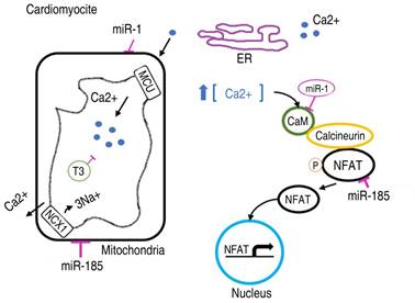 Figure 2: MicroRNA-1 downregulates the expression of crassulacean acid metabolism and directly regulates mitochondrial calcium uniporter expression during development; T3 enhances the expression level of microRNA-1, suppressor of mitochondrial calcium uniporter. MicroRNA-185 targets the sodium-calcium exchanger and nuclear factor of activated T cells 3. MCU = mitochondrial calcium uniporter, CaM = calmodulin.