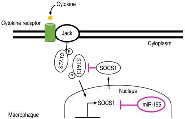 MicroRNA-155, contrary to microRNA-1 and microRNA-133, is a microRNA that promotes cardiac hypertrophy through calcium signaling pathways and inflammation pathways. MicroRNA-155 may be expressed in some macrophages.20 These macrophages expressing microRNA-155 are thought to promote cardiac hypertrophy through two pathways: the Janus kinase signal transducer (JAK) pathway and the activator of transcription 3 (STAT3) pathway; also can inhibit suppressor macrophages of cytokine-1 signaling (SOCS1), which stimulates phosphorylation of STAT3, as STAT3 is phosphorylated in macrophages, pro-hypertrophic signaling of the paracrine type is carried out in cardiomyocytes.4