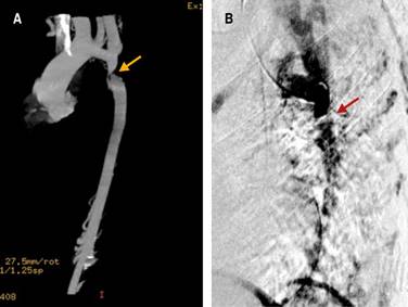 Figure 1: Reconstructed CT aortogram showing localized narrowing of the aorta. A) Reconstruction of the coronal angio-tomography, the projection shows the coarctation site that is 21 mm from the left subclavian artery. B) Digital subtraction angiography showing the thoracic aorta with coarctation.