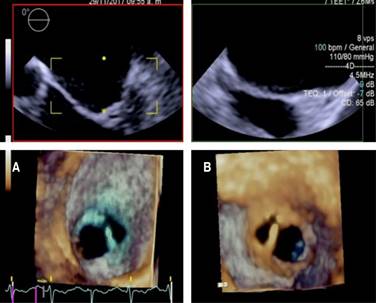 DOMVs can be anatomically classified into central, valvular, and commissural categories according to their structures or conditions; DOMV can also be classified by two-dimensional echocardiography as follows: 1) complete bridge (15% of cases), both orifice openings are circular and visible from the edge of the valve, with normal subvalvular system and papillary muscles; 2) incomplete bridge, missing valve connection and can only be visualized on the edge of the valve; and 3) hole type (most common), typically a minimally sized accessory hole in the posteromedial or anterolateral commissure.7,8 In this particular patient, the VMOV was diagnosed as type 2 according to the Baños-Rodrigo classification, since the accessory orifice (the smallest) is located in the posteromedial commissure.5