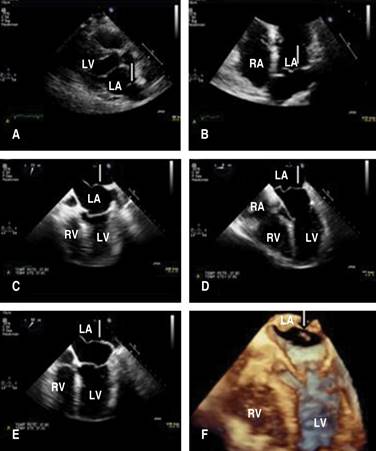 Figure 3: Transthoracic and transesophageal echocardiography. The Arrow points to the membrane that divides the left atrium. A) Transthoracic echocardiography, parasternal long axis showing membrane in the left atrium. B) Atrial-focused Transthoracic echocardiography. C-E) Transesophageal image, where the four cardiac cavities are appreciated, in the left atrium, the presence of a membrane that divides is observed. F) Three-dimensional image, showing the membrane in the left atrium.LA = left atrium, LV = left ventricle, RA = right atrium, RV = right ventricle.
