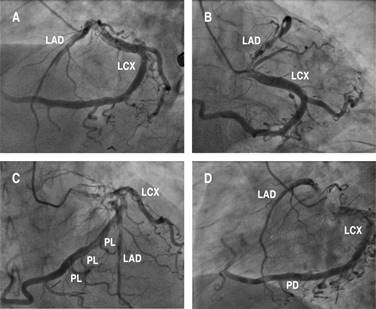 Figure 2: Coronary angiography: chronic total occlusion of the middle segment of the left anterior descending artery, the ectatic left circumflex artery in the proximal portion giving rise to three posterolateral arteries, subsequently originating posterior descending artery. A) Left anterior oblique view. B) Right anterior oblique caudal view. C) Left anterior oblique cranial view. D) Left anterior oblique caudal view.