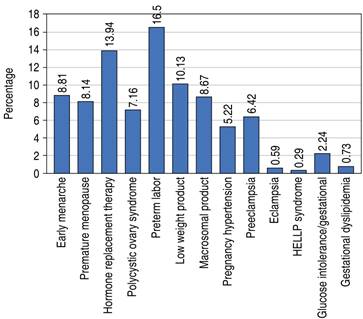 In the women who reported having had at least one pregnancy (n = 1,914), the most common history was preterm delivery in 22.8% (n = 316), followed by hypertensive disorders of pregnancy 22.1% (n = 277), of which preeclampsia was the most frequent 44.4% (n = 122); low birth weight product 10.1% (n = 194) and macrosomic product in 8.6% (Figure 2). Half of the women with a history of hypertensive disorders during pregnancy developed hypertension ten years after delivery (OR 2.53 with 95% CI 1.93-3.31). A low percentage of women reported having had diabetes or gestational dyslipidemia (2.4% and 0.73%, respectively).