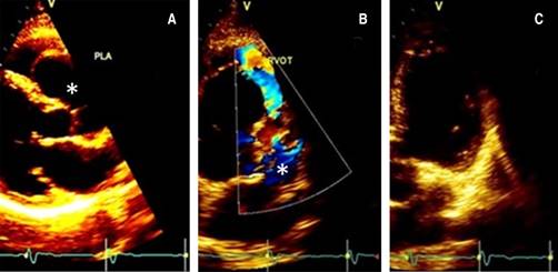 Figure 2: Doppler-echo pre-treatment; the asterisk shows the aneurysm in long (A) and short (B) parasternal and apical (C) view.