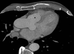 Figure 3: A chest computed tomography-sagittal view showing dilation of the aortic root and expansion of the aneurysm (asterisk) into the right ventricle.