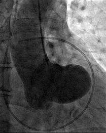 The cardiac catheterization presented normal coronaries with a small right coronary artery. The left ventricular angiogram presented inferior mild hypokinesia, and the aortogram revealed an abnormal appearance which we described as «a boot in the heart», produced by the severely dilated non-ruptured right sinus of Valsalva without fistulous tracts (Figure 4).