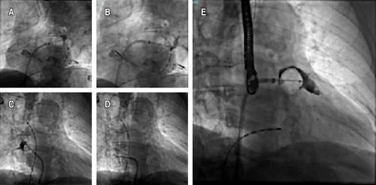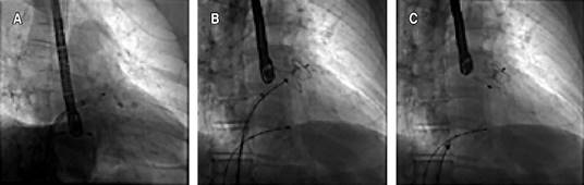 Even though conventional scores showed a low-risk result, it was considered essential to revert to sinus rhythm due to the strong thrombotic component conditioned by the UC and the contraindication for anticoagulation. An electrophysiological study was performed, followed by cryoablation of the four pulmonary veins (Figures 1 and 2), without achieving sinus rhythm, so it was decided to perform non-success electrical cardioversion twice (200 joules). The intervention team decided to perform a wide antral circumferential ablation (WACA) with posterior wall and left atrial appendage isolation, thus successfully achieving arrhythmia jugulation. Due to the hindrance of anticoagulation, after the left atrial appendage isolation, a closure device was placed in the left atrial appendage (Figures 2 and 3). After three months of optimal medical management with apixaban and amiodarone, the patient remained in sinus rhythm, and anticoagulation was discontinued. The patient is free of thrombotic and bleeding events for more than one year after the procedure and after stopping the anticoagulant.