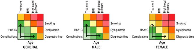 Figure 2: Colorimetry between variables and cardiovascular risk factors in patients with type 2 diabetes mellitus. Differences are observed based on gender, with emphasis on the influence of treatment, body mass index (BMI ), and time of diagnosis.
