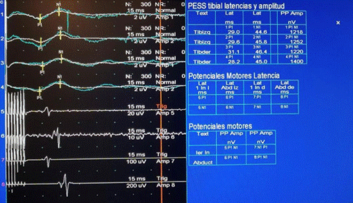 El MNIO multimodal es la combinación de diferentes técnicas neurofisiológicas y es el estándar de oro para prevenir y reducir la incidencia de complicaciones neurológicas postoperatorias24-26 (Figura 1); la combinación de PESS (Figura 2) y PEM (Figura 3) mediante estimulación sensitiva y de la corteza motora evalúa vías de transmisión con el registro de la respuesta evocada (Figura 4), lo que permite sugerir modificaciones durante el procedimiento, detectando, preveniendo y disminuyendo la incidencia de déficit neurológico postoperatorio hasta 60% en cirugía de columna22,26 con beneficio comprobado en corrección de escoliosis;9,27-29 y como componente de rutina en cirugías por deformidades o tumores intramedulares, reduciendo complicaciones y maximizando una resección adecuada.23