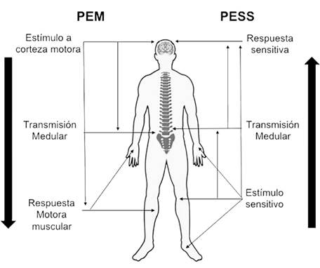 El registro de potenciales evocados (PE) representa la técnica electrofisiológica con mayor capacidad para proporcionar medidas cuantitativas, objetivas y oportunas para la vigilancia de la integridad funcional de ME, raíces nerviosas y adecuación del suministro vascular a estos elementos,4,9,21 ya que permite el reconocimiento de manera rápida y en tiempo real de cambios funcionales en vías motoras, sensitivas y estructuras nerviosas que las conforman (tractos anteriores y cordones posteriores).5,21-22