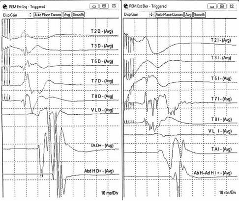 Figura 6 Potenciales Evocados Motores de extremidad inferior, T2, T3, T5, T7, T8, vasto lateral, tibial anterior, abductor del primer dedo