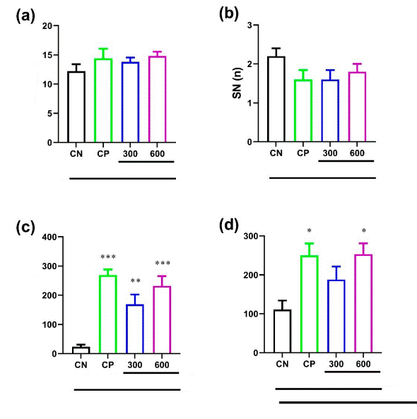As shown in Figures 1 (a,b) , and confirmed by analysis of variance, there were no significant variances between the experimental groups concerning the STLa indexes [F (3,20) = 0.99, P = 0.423, ηp2 = 0.16] and the SN in acquisition trail [F (3, 20) = 1.60, P = 0.229, ηp2 = 0.23]. As for the STLr [F (3,20) = 17.63, P <0.001, ηp2 = 0.77] and TLC [F (3,20) = 5.31, P = 0.009, ηp2 = 0.50] indices, the memory retrieval stage one-way ANOVA displayed a significant change between the experimental groups (Figure 1c,d) (). The Tukey post hoc test indicated that the cp group produced a significant rise in the mean of STLr (P <0.001) and TLC (P = 0.018) indices in comparison to the CN group (Figure 1 (c,d)) . There was also a significant rise in the group receiving BHE in doses of 300 and 600 compared to the CN group in STLr (P = 0.005, and P <0.001, respectively) parameter. As for TLC parameter only the dose of 600 of BHE has showed a significance increase in comparison with CN group (P = 0.015).