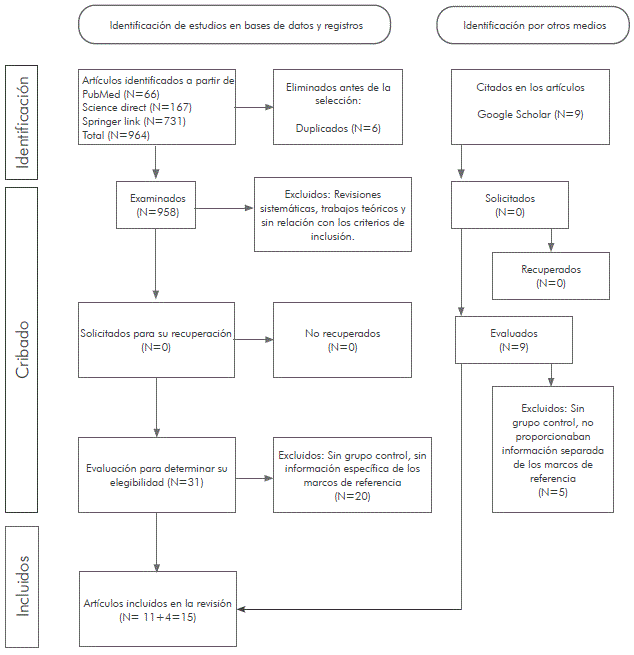 En la búsqueda inicial se encontraron 964 artículos, cada uno de ellos se registró en una hoja de cálculo, se ordenaron alfabéticamente y seis documentos duplicados se eliminaron de forma manual. Con la lectura del título, el resumen y las palabras clave se descartaron 927 documentos que no tenían relación con el tea y los marcos de referencia, ni con las tareas de toma de perspectiva visuoespacial, navegación espacial y/o rotación mental. Se eliminaron, también de forma manual, las revisiones sistemáticas y los trabajos teóricos, obteniendo un total de 31 artículos.
