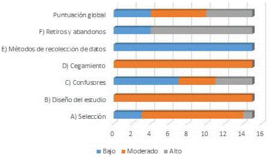Se evaluaron los 15 artículos incluidos en esta revisión. Los resultados mostraron cuatro estudios con puntaje general de riesgo bajo, seis con riesgo moderado y cinco con riesgo alto (Figura 1). Las dos secciones con mayor sesgo son retiros y abandonos, y variables confusoras (Tabla 1).