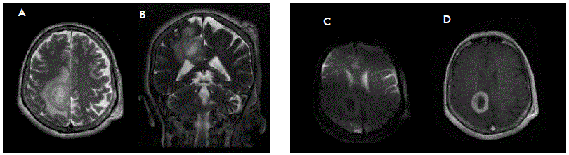 Figure 1 Magnetic resonance imaging. A-D Brain lesion identified during diagnostic assessment. Axial T2-weighted imaging (A) shows an intrinsic heterogeneously lesion located in the left central lobe, well delimited with significant perilesional edema. Contrast-enhanced T1-weighted imaging (D) demonstrates peripheral contrast uptake, with effacement of surrounding brain sulci. Coronal T2-DWI (B) shows no apparent restriction.