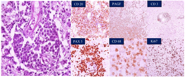 There were apoptotic bodies amid these spaces. Immunohistochemical staining was positive for CD20, PAX- 5, and Ki-67, highlighting neoplastic cells; there were CD3 stained in T cells.