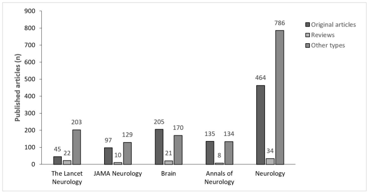 Figure 1 Number of articles published in top neurology journals during 2021, according to text types.