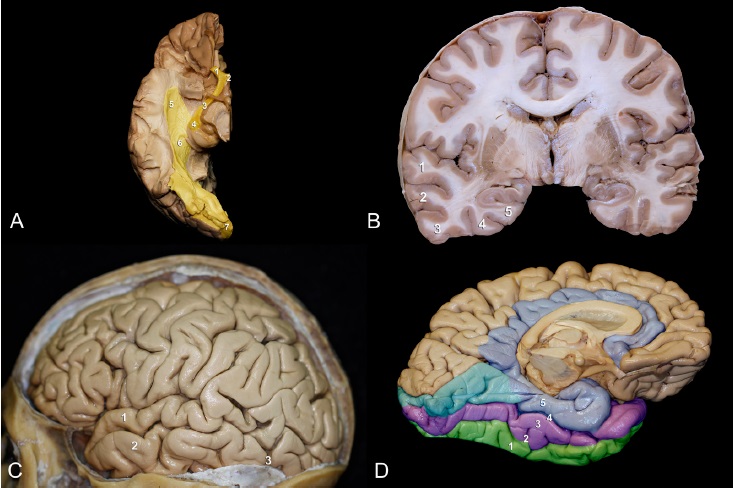 El lóbulo temporal se sitúa por debajo de la cisura lateral o de Silvio, clásicamente dividido en cinco circunvoluciones o giros (nombrados de T1 a T5) y cuatro surcos (t1 a t4)21(Figura 1B).