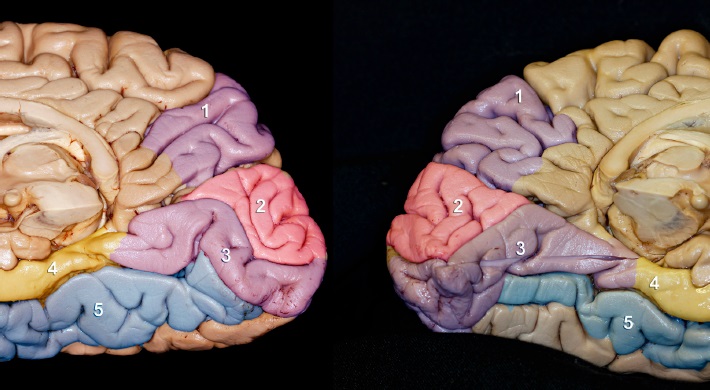 Figura 2 Cara medial de hemisferio derecho e izquierdo, lóbulos occipital y temporal: 1) precuneo, 2) cuneo, 3) giro lingual, 4) giro parahipocampal, 5) giro occipitotemporal medial