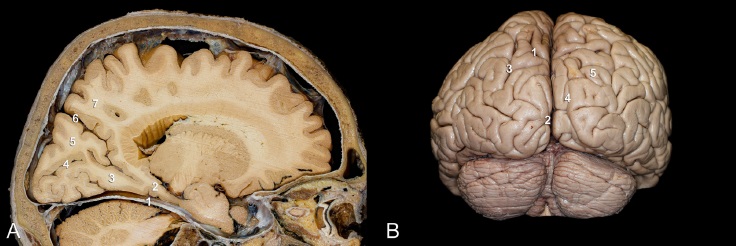 Figura 3 A. Corte parasagital: 1) tentorio, 2) giro parahipocampal, 3) giro fusiforme, 4) surco calcarino, 5) cuneo, 6) surco parieto-occipital, 7) precuneo. B. Cara posterior lóbulo occipital: 1) cisura parieto-occipital, 2) cisura calcarina, 3) surco intraparietal, 4) surco lunatum, 5) lóbulo parietal superior.
