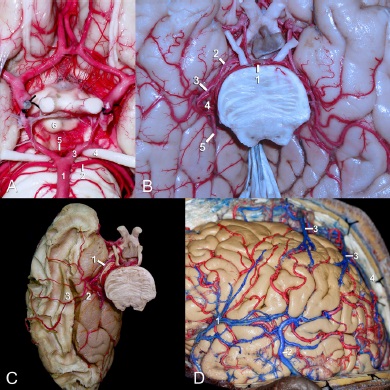 Figura 4 A. Arteria cerebral posterior: 1) arteria basilar, 2) arteria cerebelosa superior, 3) segmento P1 de la ACP, 4) nervio craneal oculomotor, 5) arteria talamoperforantes posteriores, 6) cuerpos mamilares. B. Cara ventral del lóbulo temporal y occipital y su relación con la arteria cerebral posterior: 1) arteria basilar, 2) segmento P2a, 3) segmento P2p, 4) segmento P3, 5) segmento P4. C. Disección de la región temporo-occipital por método Klingler e inyección vascular cerebral con látex. Irrigación de sustancia blanca y sustancia gris de la cara ventral de la región temporo-occipital: 1) arteria cerebral posterior, 2) giro parahipocampal, 3) fascículo longitudinal inferior. D: 1) vena cerebral media superficial, 2) vena anastómotica menor (Labbé), 3) venas corticales ascendentes, 4) seno sagital superior.